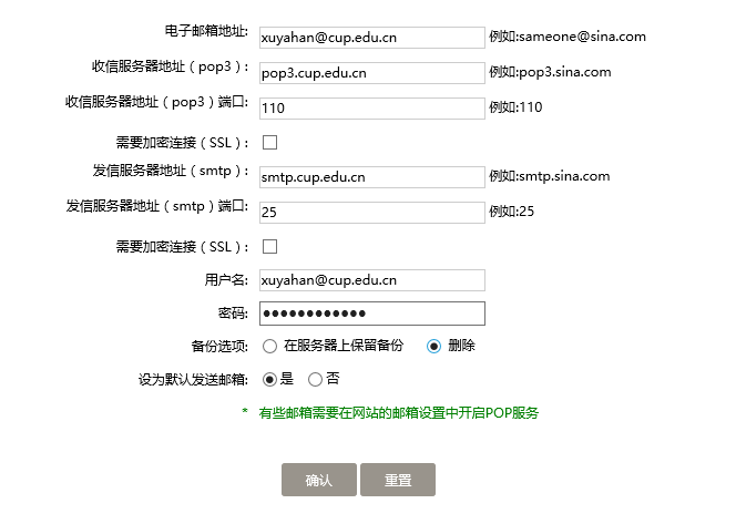 第二步 郵箱配置如下。系統可設置多個郵件域,新建郵箱時如果設為默認發送郵箱,以后發送郵件就會以這個郵箱作為發信郵箱。電子郵件地址為個人要設置的郵箱地址,用戶名和密碼為設置郵箱的用戶名及密碼,備份選項選擇“刪除”。