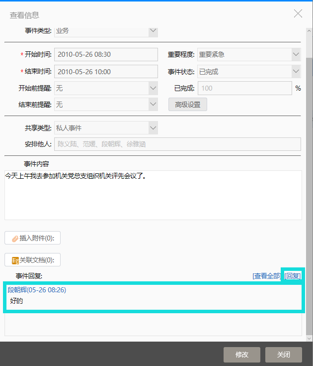 雙擊具體的共享事件進(jìn)行查看。事件的所屬人、發(fā)起人以及所有共享對象可以回復(fù)共享事件,也可以看到他人回復(fù)的內(nèi)容。 點(diǎn)擊【回復(fù)】 也可以留言。