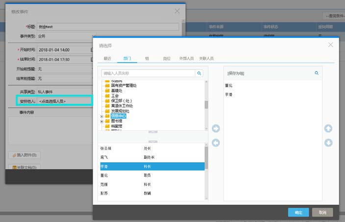 新建日程后, 用戶還可將事件安排給他人執(zhí)行。從選人列表中選擇一個或多個用戶。事件建立后,該事件的所屬人即為被安排人,該事件為【安排事件】 。