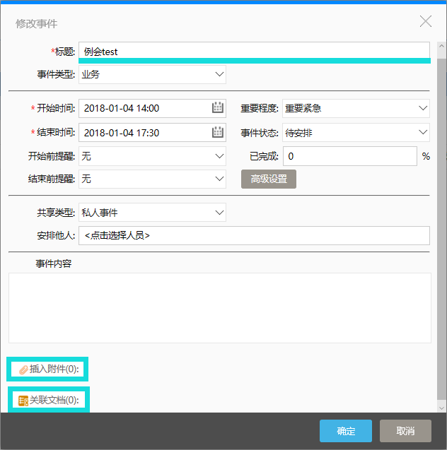 點(diǎn)擊新建創(chuàng)建日程事件。 輸入事件相關(guān)信息,如:事件標(biāo)題、起止時間、狀態(tài)、重要程度等;勾選提醒,系統(tǒng)會在事件開始時通知提醒;點(diǎn)擊【高級設(shè)置】按鈕出現(xiàn)高級設(shè)置頁面,可以設(shè)置事件的完成率等信息。