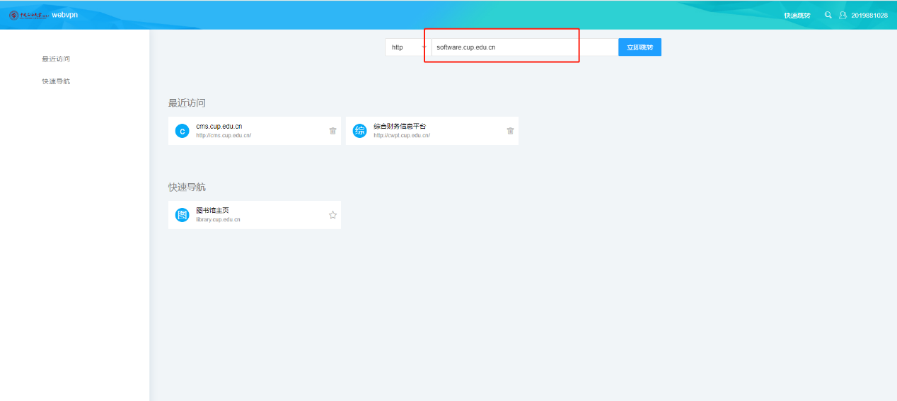舉例說明:如需訪問正版化軟件服務平臺,可直接在搜索框內輸入該網站地址:software.cup.edu.cn,點擊“立即跳轉”按鈕,即可進入正版化軟件服務平臺的登錄界面。如下圖所示: