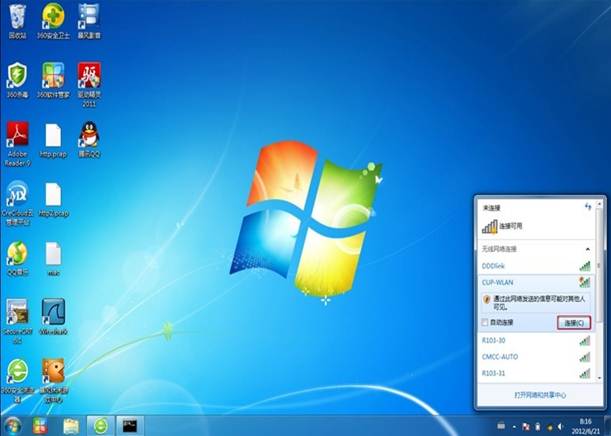左鍵點擊桌面右下角網(wǎng)絡(luò)連接圖標會彈出網(wǎng)絡(luò)連接窗口,從窗口列表中選擇無線網(wǎng)絡(luò)名“CUP-WLAN”點擊連接,等待連接成功。