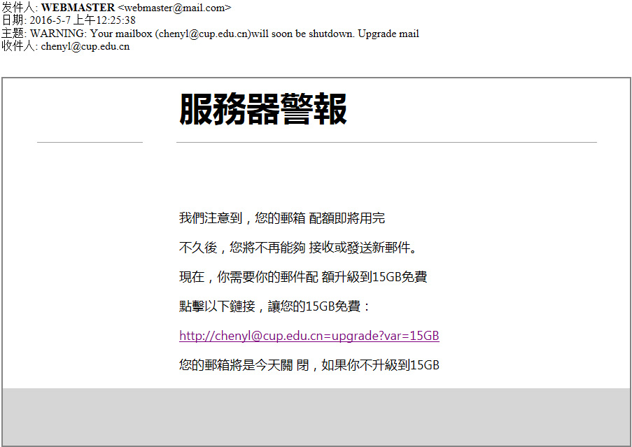 近期我校電子郵件系統(tǒng)經(jīng)常收到“釣魚郵件”,冒充管理員身份欺騙用戶發(fā)送個(gè)人信息,以達(dá)到盜取用戶賬號(hào)密碼的目的。在此信息技術(shù)中心聲明:信息技術(shù)中心不會(huì)以任何形式向用戶主動(dòng)索取用戶名及密碼等信息,請(qǐng)用戶提高警惕,遇到此類郵件立即刪除。