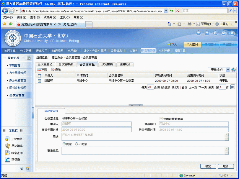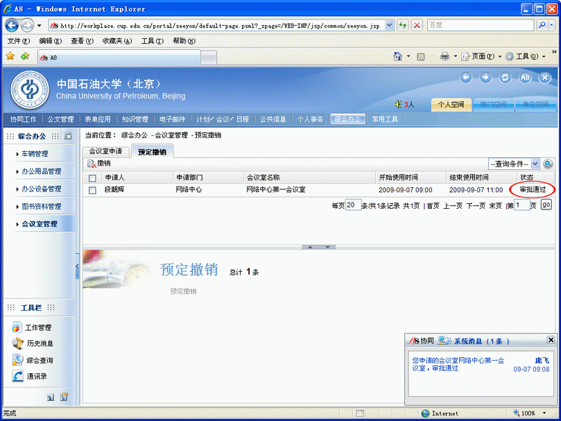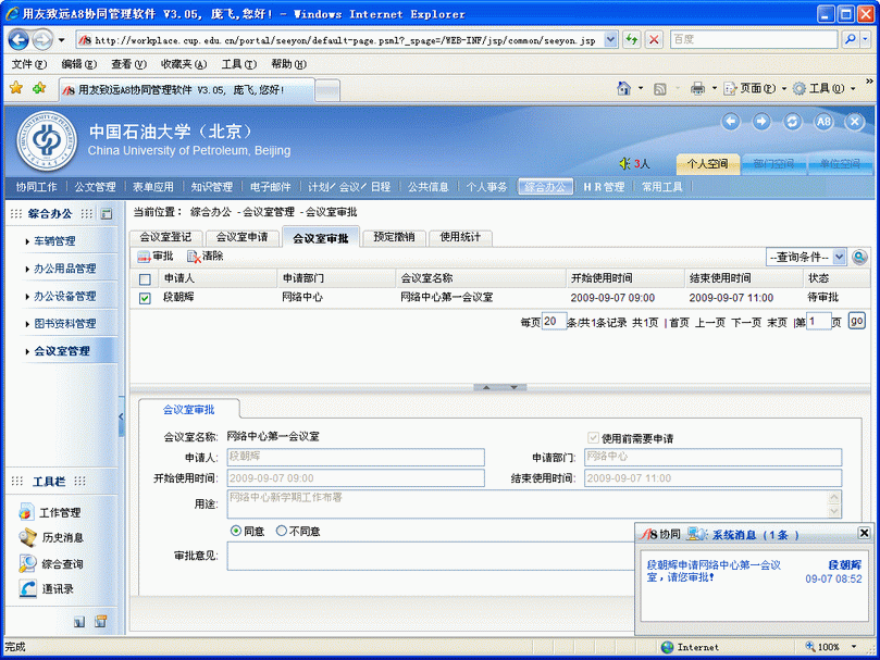 會議室管理員登錄后接到會議室申請通知并完成審批,如下圖。