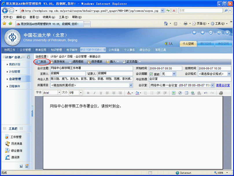 會議主持人新建會議(選擇與會人員、選擇會議室、確定會議開始與結束時間等)并發送會議通知給與會人員(如下圖)。