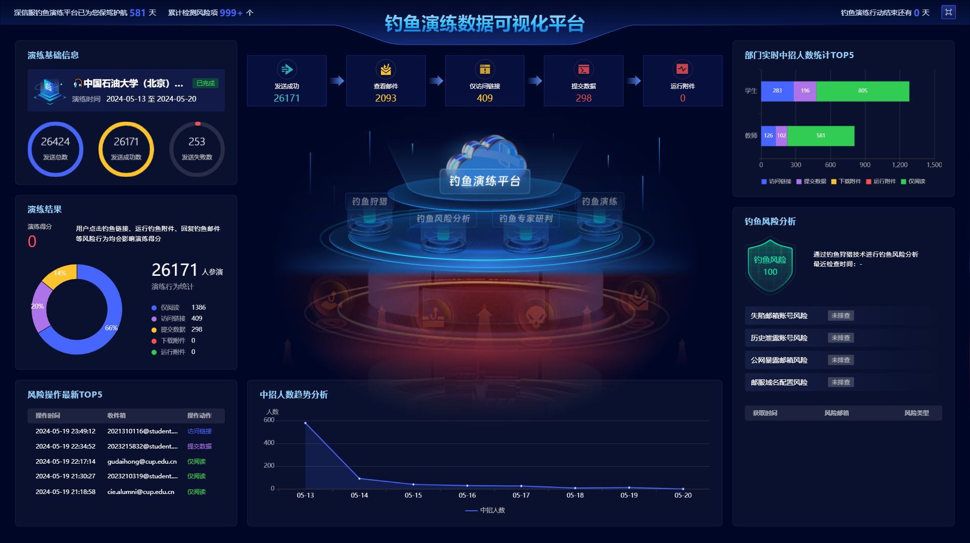 本次釣魚演練投放樣本覆蓋全校教職工和學生,發送共計26424封釣魚郵件(教師:2516,學生:23908),截止到2024年5月20日,一共有707位師生中招,演練情況統計如下: