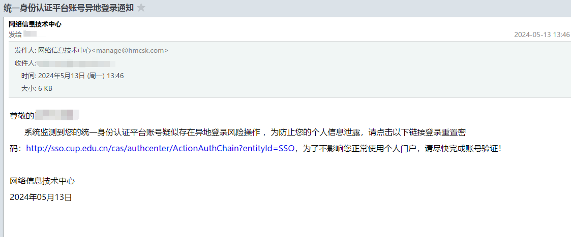 圍繞統一身份認證(https://sso.cup.edu.cn/login)系統,制定“統一身份認證平臺賬號異地登錄通知”郵件文案,發送到全校師生目標郵箱: