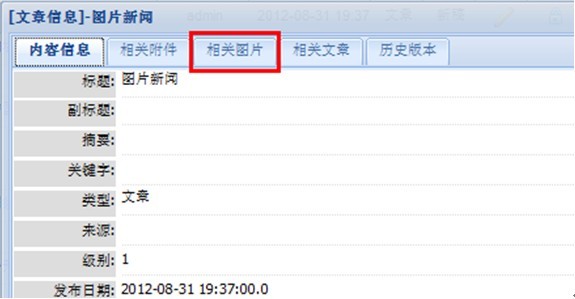 2.在編輯狀態(tài)下,點擊文章標(biāo)題。在彈出的文章信息窗口下點擊標(biāo)簽“相關(guān)圖片”: