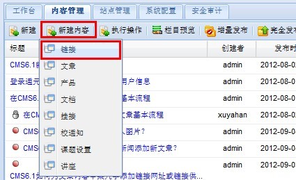 1.新建一篇鏈接文章。方法即:在內容管理中點擊新建內容,選擇“鏈接”:
