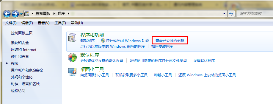 1.“控制面板”---“程序”----“查看已安裝的更新”