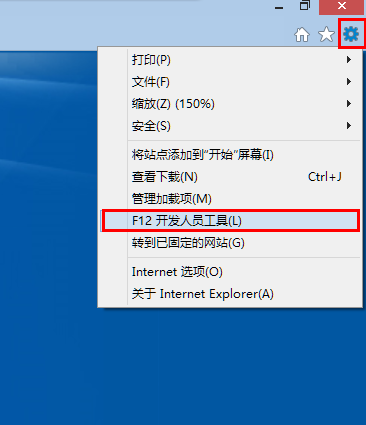 第一步:打開IE 瀏覽器,點擊“工具”(右上角齒輪狀圖標)--“F12開發人員工具”,如下圖: