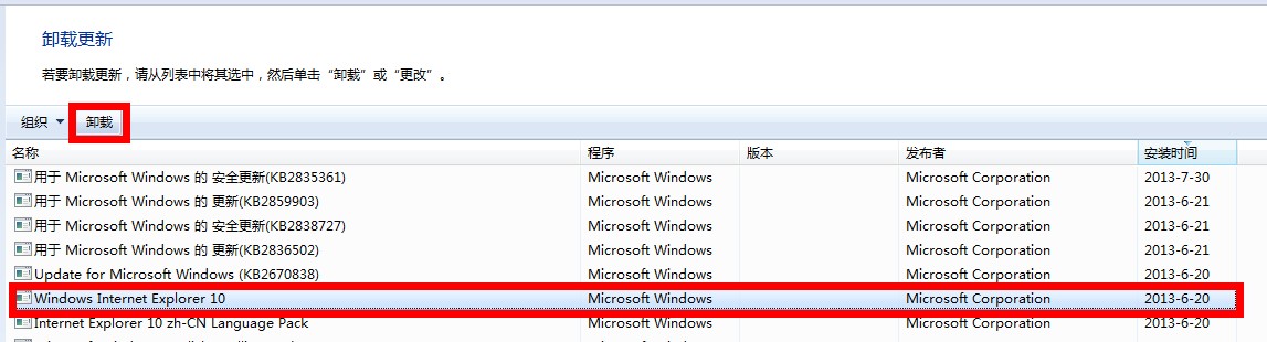 2.在“Microsoft Windows”類中找到更新的IE 10或者IE 11。選中后點擊“卸載”。IE 11還需卸載同時更新的語言包。