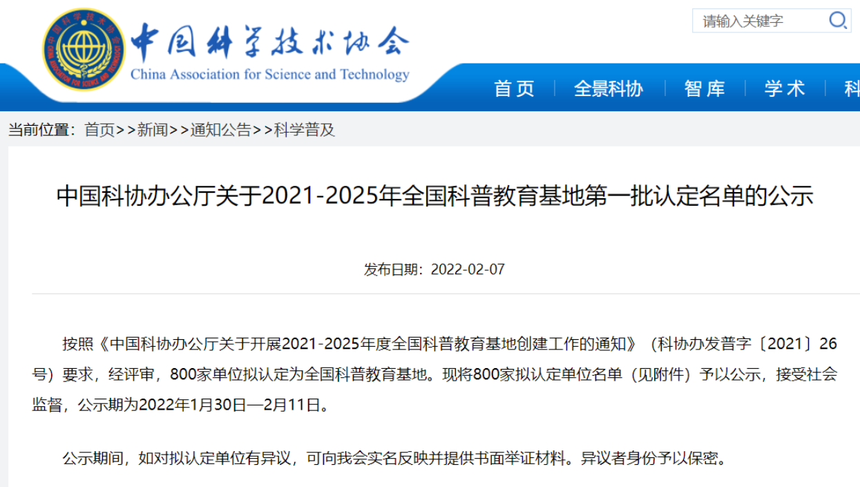 《中國(guó)科協(xié)辦公廳關(guān)于2021-2025年全國(guó)科普教育基地第一批認(rèn)定名單的公示》