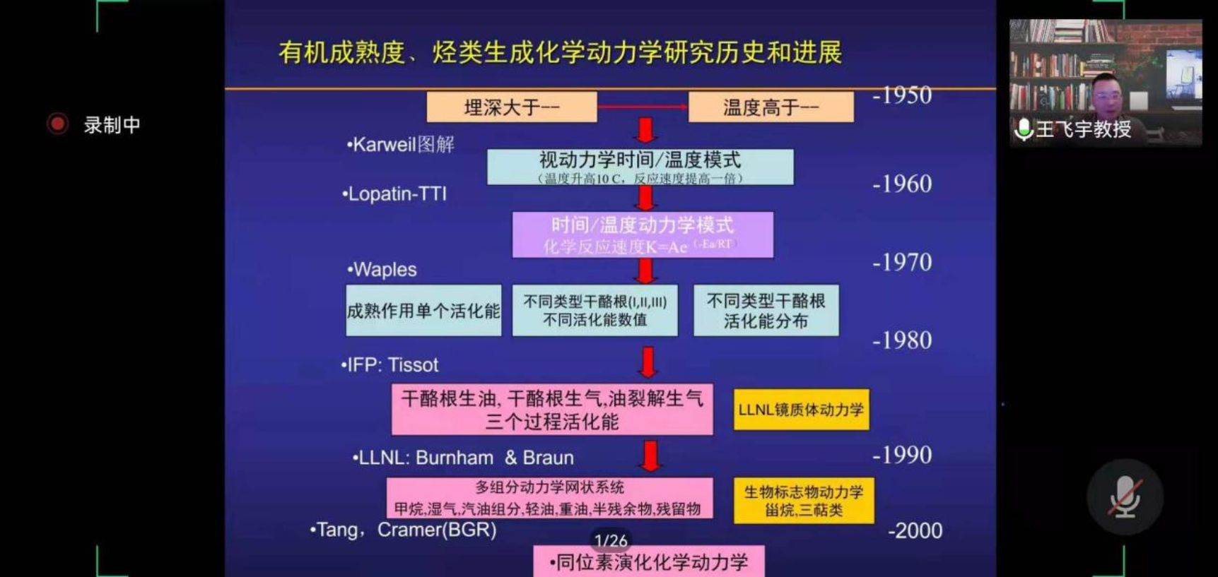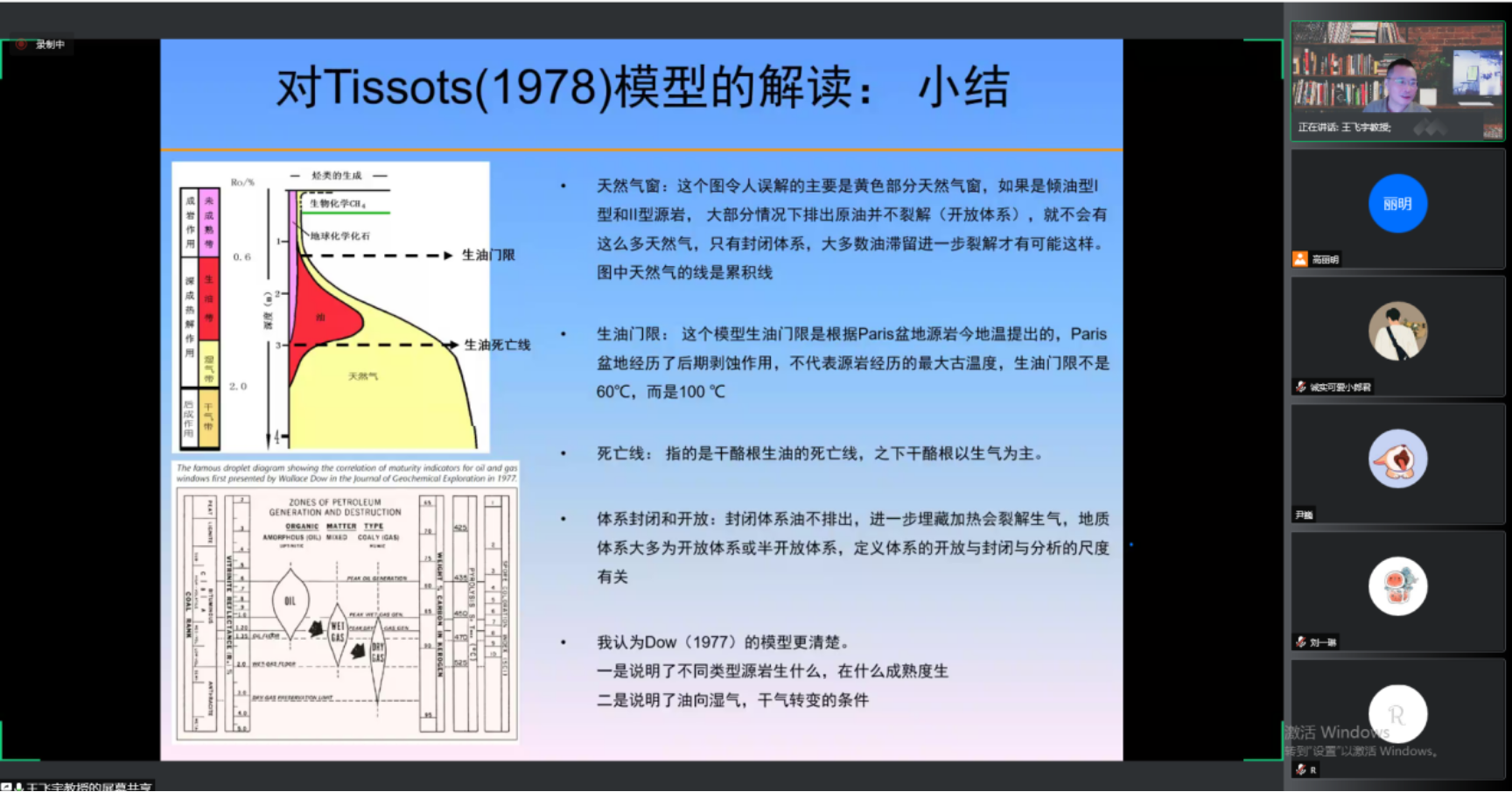 本次報告中,王飛宇教授梳理了生排烴模型的形成和演變,探討了如何建立生排烴模型及如何理解和應用Tissot模型,認為同一有機相源巖生烴動力學模型的參數變化不大;結合實例,探討了什么樣的生烴模型地質上較為合理,提出了實驗數據與地質條件數據相結合是建立合理生烴動力學模型的重要途徑;分析了生油溫度的范圍、地質條件下時溫補償的大小、干酪根生油和原油裂解氣、殘留烴量和源巖排油效率、未熟油和低熟油成因、凝析油氣成因,認為要提高含油氣盆地生排烴量預測的精度,重要的不確定定因素有:源巖非均質和不同有機相源巖厚度、有機質成熟度、生排烴模型。