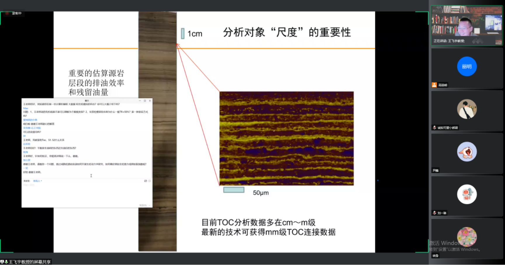 報告內容在與會師生及專家中引起強烈反響,大家紛紛表示王教授的報告內容新穎、收益良多。王教授對大家提出的如何利用大數據進行生烴模擬、高過成熟烴源巖應該如何開展生烴動力學研究、如何確定原始生烴潛力或原始氫指數、目前發現的頁巖油地層的排油效率的大概范圍及其能否用于指示頁巖氣地層當時的排油效率范圍等二十余個問題進行了認真的解答和探討,并表示在今后的研究中,歡迎大家隨時聯系,探討問題。