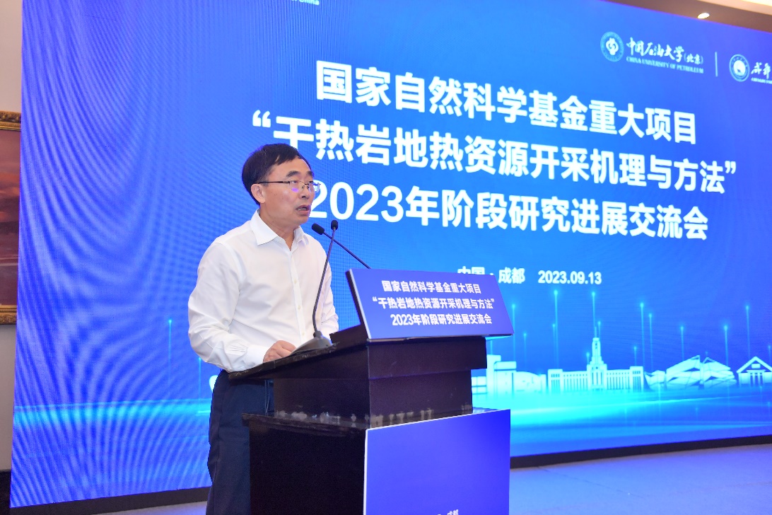 9月13日,國家自然科學基金重大項目“干熱巖地熱資源開采機理與方法”研究進展交流會在成都世紀城會議中心召開。該項目由中國石油大學(北京)牽頭,聯合成都理工大學、深圳大學、中國科學院地質與地球物理研究所和中石化石油工程技術研究院等單位共同承擔。國家自然科學基金委工材學部副主任苗鴻雁、工材學部工程一處項目主任王西勃等,羅平亞院士、謝和平院士、多吉院士、李根生院士、楊春和院士、孫煥泉院士、張來斌院士以及成都理工大學校長劉清友等20余位專家領導出席此次會議,各課題相關負責人和項目骨干成員參加會議。本次會議由中國石油大學(北京)主辦,成都理工大學承辦。項目負責人李根生院士主持會議。