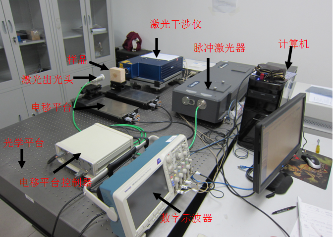 性能指標(biāo):Tolar-1053固體激光器:波長(zhǎng)1053nm,脈寬100ns,輸出能量10mJ;TEMPO-2D激光干涉器:面外靈敏度2*10-7nm(W/Hz)1/2, 帶寬10KHz-10MHz,激光能量300mW(532nm),透鏡焦距30-100mm