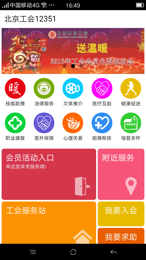 為了加大對會員服務的力度,北京市總工會相繼推出了兩項手機APP軟件,一是“北京工會12351”APP,內容包括醫療互助、技能助推、健康促進、職業康復、意外保障、困難幫扶、工會服務站、會員活動報名等,是北京市工會會員獲得工會幫扶、參加市總工會優惠活動和參加我校工會活動報名的有效渠道,校工會要求各部門工會通知本部門工會會員安裝此應用APP(可在豌豆夾或手機軟件商店搜索北京工會12351安裝),并注冊會員信息,以方便獲得北京市總工會活動資訊及報名參加我校工會活動。