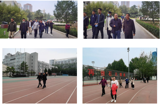 此次長走路線自第二教學樓前林蔭道開始,途徑圖書館、體育館等學校標志性地點,到達紅旗操場。初秋季節,校園里褪去了炎熱,秋高氣爽,一排排梧桐疊翠流金。紅旗操場上,嶄新的操場勾起了老師們對自己青蔥歲月的回憶,三五成群,一路談笑風生,或懷念過去,或暢想未來,歡快的笑聲為秋日的校園增添了一抹別樣的色彩。