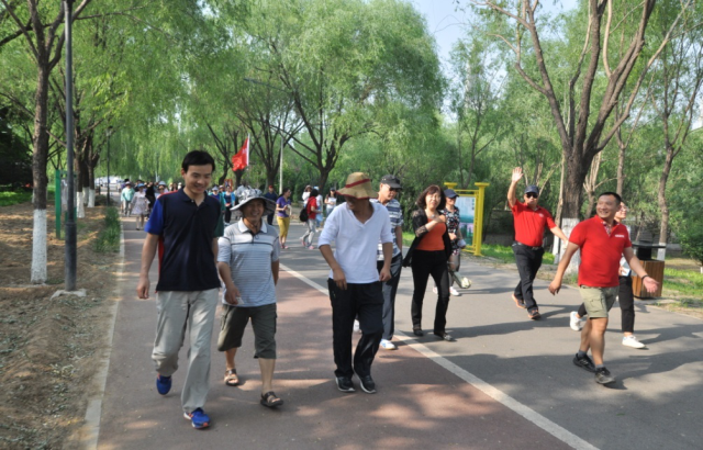 長走開始了,大家呼吸著新鮮空氣,欣賞著沿途的碧水、綠樹、繁花,一邊快步走著,一邊交流著工作和生活中的問題。雖然太陽有些曬,但絲毫未影響大家徒步健身的興趣和快樂。僅用一個小時,就從昌平南大橋下濱河公園正門,繞行濱河公園南側一周,走完約7公里的全程。