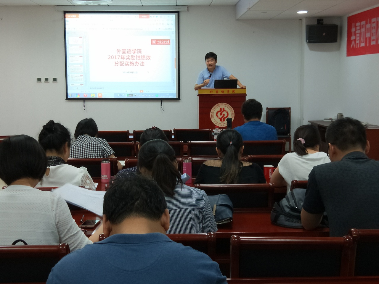 2017年6月21日下午1:30,外國語學院工會組織教代會會議討論2017年獎勵性績效工資分配實施辦法和2014-2017年科研績效獎勵辦法。會議由學院黨委書記李玉財主持。