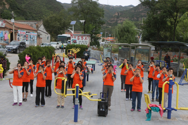 金秋季節,山里涼爽的天氣略帶一絲寒冷。老師們全然不顧,列隊在村中央廣場為過往游客和鄉親們吹奏了《龍的傳人》、《歡樂頌》等五首曲目。接著,大家步行到長峪城山腳下,在“長峪城抗戰圣地”的宣傳牌下,陶笛協會的會員高舉祝福石大65周歲生日的宣傳牌,手拿“‘笛韻情悠’陶笛協會慶祝石大65誕辰”的橫幅合影留念,共同祝愿石大65周歲生日快樂。