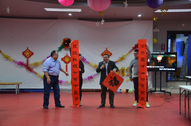 活動開始,由院領導做新年祝詞。方鳳玲院長對2018年本院做出的成績進行了簡明總結,同時指出還有待繼續努力的地方,鼓勵大家在2019年鼓足干勁,積極奮進。王培杰老師并給院集體書寫了一個大大的“福”字以及對聯一副“巍巍社稷七旬中國夢近,濟濟良才卅余馬院振興”,表達了對于馬院未來的美好祝福。本院每位老師還得到王培杰老師書寫了一個“福”字,并一本院里贈送的書籍《馬克思傳》。隨后的環節里,學院的老師們紛紛演唱了自己喜愛的歌曲,或獨唱,或合唱;或有伴奏、或是清唱;中文歌曲還有俄語歌曲。歌曲演唱中還穿插有謎語競猜,由一位老師在臺前根據某一成語表演動作,大家在臺下猜。演唱和謎語競猜活動活潑生動。