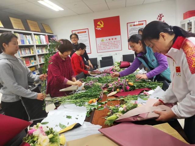 會議室鮮花團簇,由李玲老師為大家講解花的品種、色彩搭配和造型設計等知識,并展示了從選花、插花到包裝的步驟,在李玲老師的指引和幫助下,大家積極創作,沉浸在自己的作品之中,互相合影留念,都不愿錯過這有意義的美好瞬間。