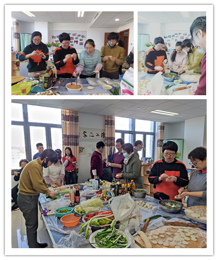 外國語學院的各位老師從家里帶來鍋碗瓢盆和拿手好菜,一起搟面包餃子,分組準備聯誼會的食品,大家邊干活邊交流,歡聲笑語迎接新的一年。在享用大家庭熱乎乎的餃子和香噴噴的菜肴時,老師們總結了過去一年的工作,交流思想,嘮家常,互相關愛,展現了新年新的氣象、新的風尚。工會還組織了抽獎環節,有十五位老師分別獲得一等獎或二等獎。