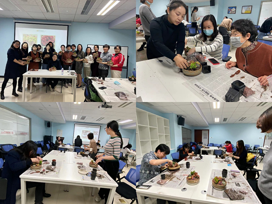 活動邀請到的專業園藝師首先就多肉的種類、種植、養護經驗,以及澆水、日照、病蟲害防治等知識做了詳細的講解。然后為大家手把手指導多肉的種植。老師們都變身為巧手花匠,興致盎然地培土、栽種、鋪石、裝飾……,并按照種類、顏色、層次搭配組合,一盆盆造型別致、綠意盎然的多肉植物呈現在大家眼前。完成種植后,大家一起拿著精致的作品拍照,相互點評,樂在其中。