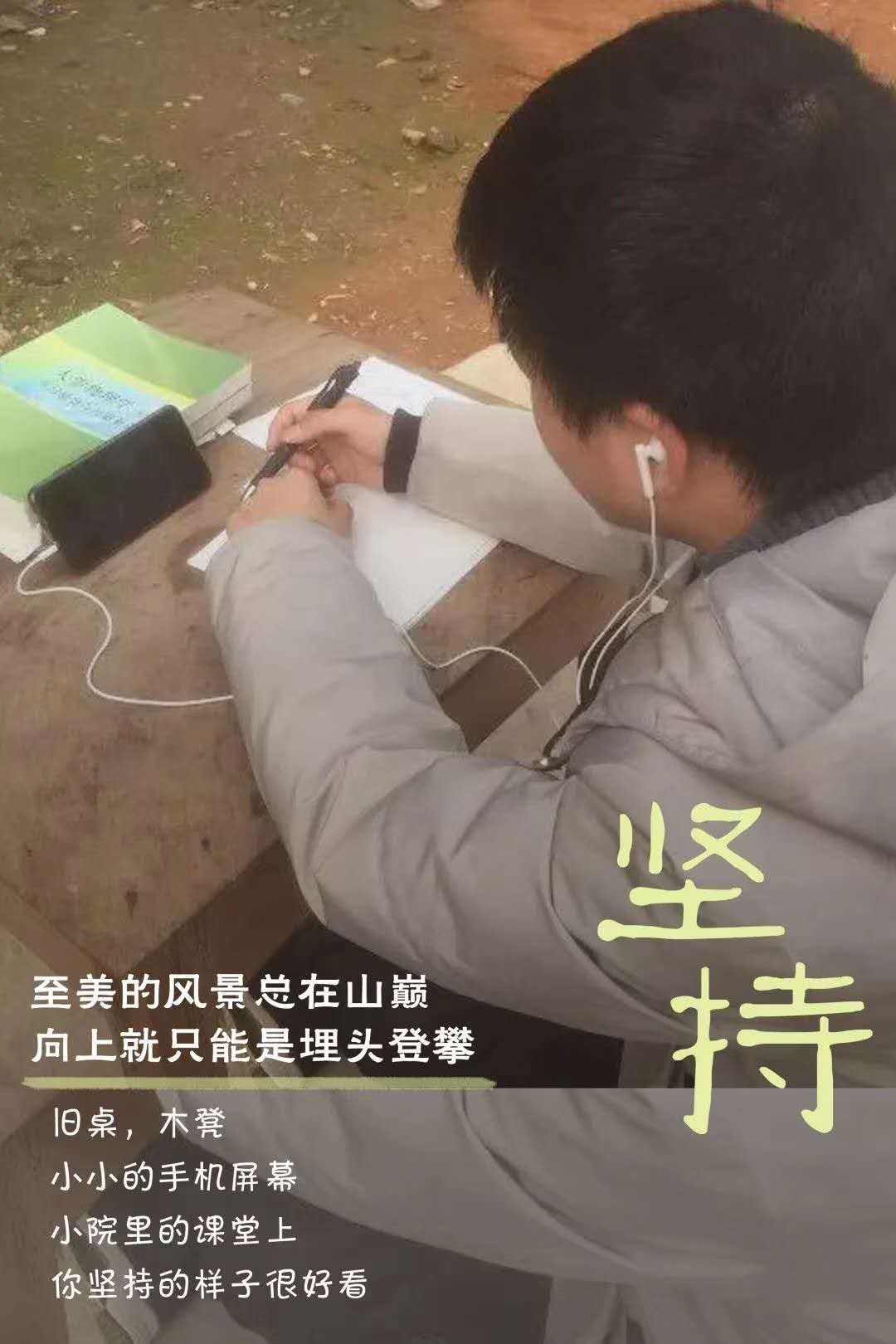 至美的風景總在山巔,向上就只能是埋頭登攀,小桌、木凳,小小的手機屏幕,小院里的課堂上,你堅持的樣子很好看。