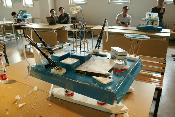 本次比賽分為初賽和決賽兩個(gè)階段。初賽于25日下午舉行,選手們根據(jù)設(shè)計(jì)書(shū)在規(guī)定的時(shí)間內(nèi),用給定的材料進(jìn)行了鉆井平臺(tái)模型制作,經(jīng)過(guò)嚴(yán)格的篩選,共選出9支隊(duì)伍進(jìn)入決賽。