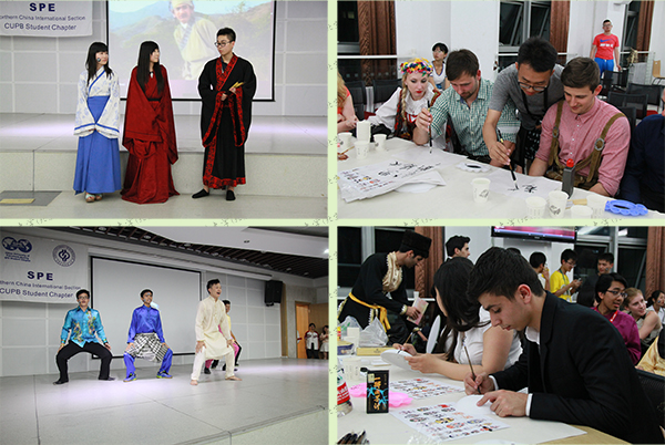 23日晚,SPE文化之夜在學(xué)生活動中心報告廳舉辦。各國代表表演了具有本國特色的舞蹈、音樂等節(jié)目,石大SPE分會學(xué)生向各國參賽選手展示了太極、漢服等中國傳統(tǒng)文化,一同學(xué)習(xí)戲劇臉譜、風(fēng)箏繪制和漢字書寫,觀看了糖畫、花鳥字等中國民間藝術(shù)的制作。活動氛圍輕松自由,促進(jìn)了各國文化交流。