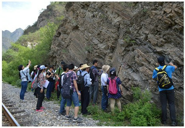 5月30日上午,在石大地球科學學院教師高崗與吳欣松的帶領下,6所高校共25名學生乘車赴北京門頭溝下葦甸進行野外地質考察。門頭溝下葦甸地區位于妙峰山區域,地層發育較全,露頭特征具有典型性和代表性。同學們在教師指導下對該區青白口系至上寒武統地層剖面以及主要巖性特征與結構構造特征進行了觀察,并對該區典型的褶皺、斷裂等構造現象進行了分析。