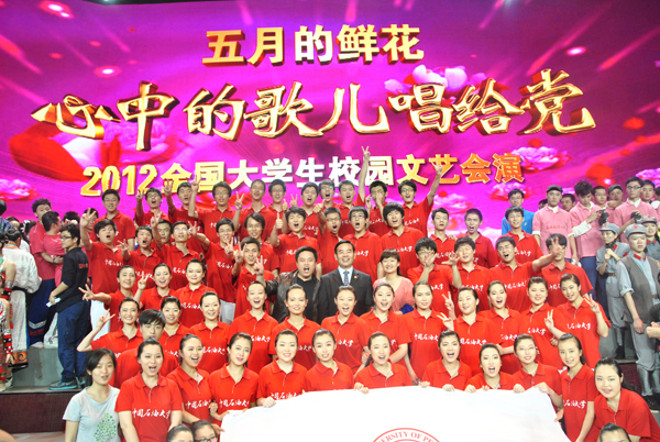 展示青春的風采,唱響心中的贊歌。由中宣部、教育部、共青團中央主辦,中央電視臺承辦的全國大學生校園文藝會演《五月的鮮花––心中的歌兒唱給黨》5月4日晚在中央電視臺一號演播大廳隆重上演,來自全國近百所高校的2500多名大學生參加演出,中國石油大學60名學生參演的大合唱《迎風飄揚的旗》被安排在第三十個節目,壓軸出場。