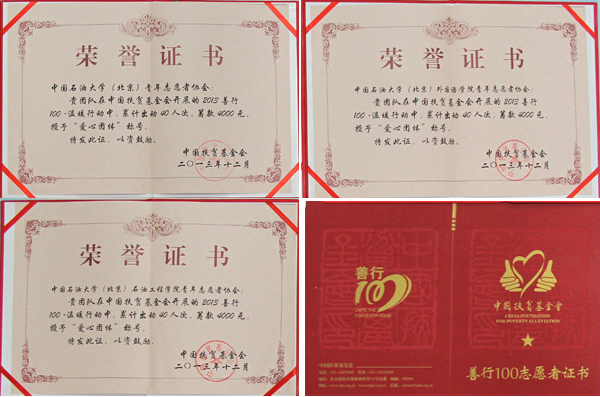 近日,中國扶貧基金會對全國各地參與“善行100溫暖行動”志愿服務活動的突出團體和個人予以表彰。中國石油大學青年志愿者協會、外國語學院青年志愿者協會、石油工程學院青年志愿者協會被授予“愛心團體”稱號,郭旺、李坤潮、姚池三人被授予“優秀服務者”稱號,另有39名志愿者獲得“一星級善行100志愿者”證書。