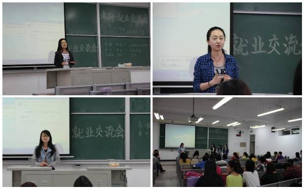 本次交流會包括考研、就業和留學3個部分。易唯、易彩分享了考研路上如何在校內與校外、本專業與跨專業、學術性與專業型等選擇中權衡取舍;王媛媛分享了如何成功就業的經驗,別對保研與就業的取舍,國企、公務員與外企的對比,就業簡歷與面試技巧等方面進行了講解;蔡曉珺分享了普華永道實習生應聘經驗與技巧以及到加州大學圣塔芭芭拉分校出國留學的申請歷程等。