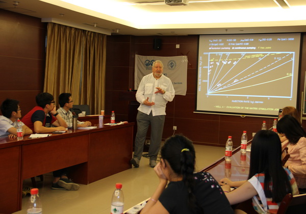 Giovanni Paccaloni曾多次在世界各地開展高等采油工程的講解,本次公開課的主題為“基質酸化實時優化處理方法”。講解中,Giovanni Paccaloni以形象生動的語言將專業術語進行了詳細的闡述,并通過大量案例對基質酸化技術的發展情況進行了講解。現場學生被他的風趣幽默所感染,積極參與互動,對相關的知識進行了熱烈地探討。Hernan Buijs主講的內容為“非常規油氣資源發展及頁巖氣開發實例探討”。他講解了非常規油氣資源發展及頁巖氣開發處理軟件,并現場展示該軟件處理頁巖氣井壓裂的過程。