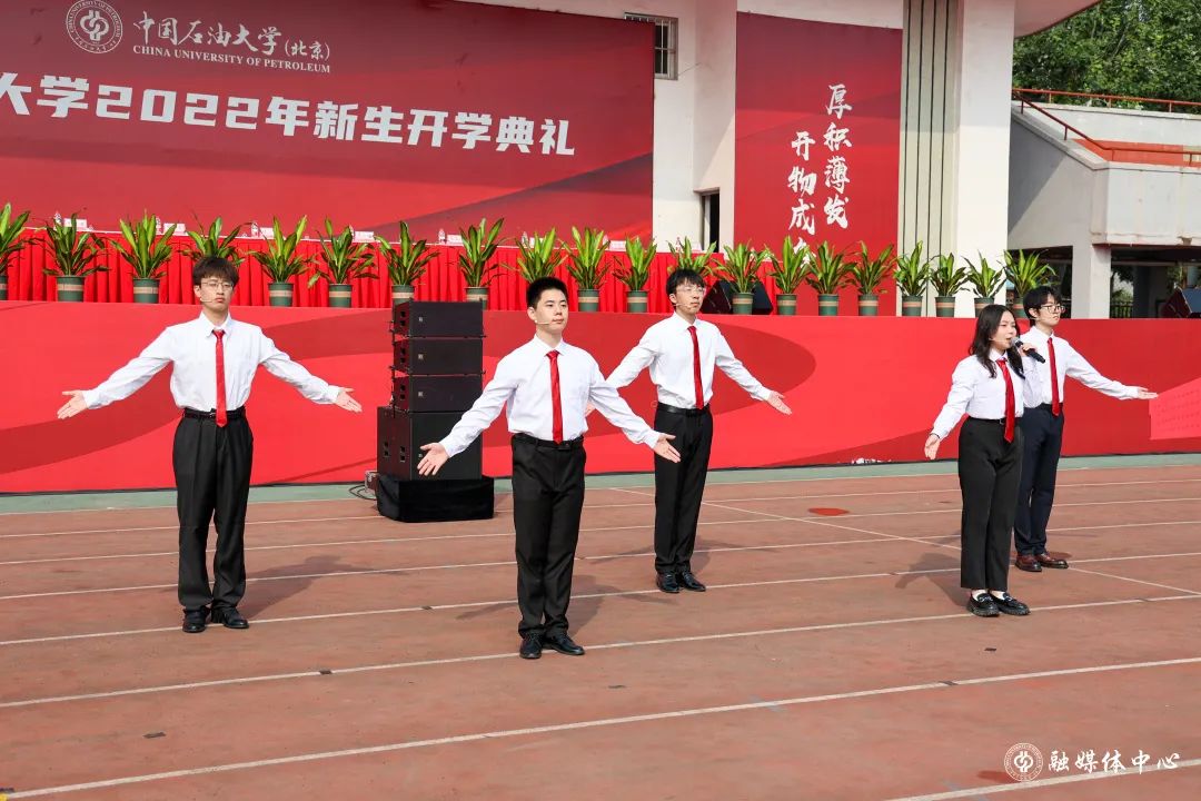 今年的開學典禮設置了暖場表演、新生佩戴校徽、新生入學宣誓等環節,為中石大的“新主人”們打造了特殊的入學儀式。“青春逢其時,能源定未來。”來自大學生藝術團的同學們飽含深情的朗誦勾勒出一代代石油人艱苦創業、矢志奮斗的身影,歡快悅動的歌舞彰顯出中石大新青年們青春勃發的力量。