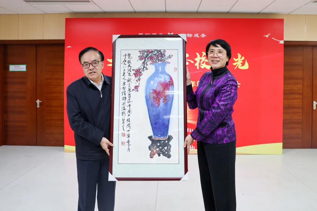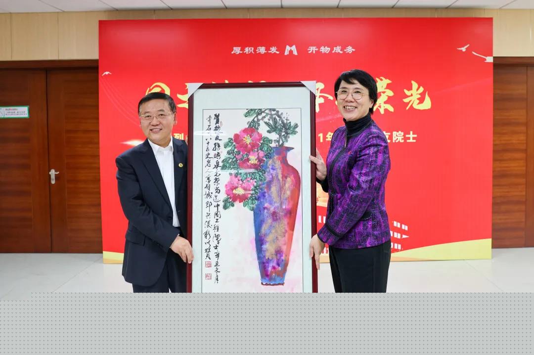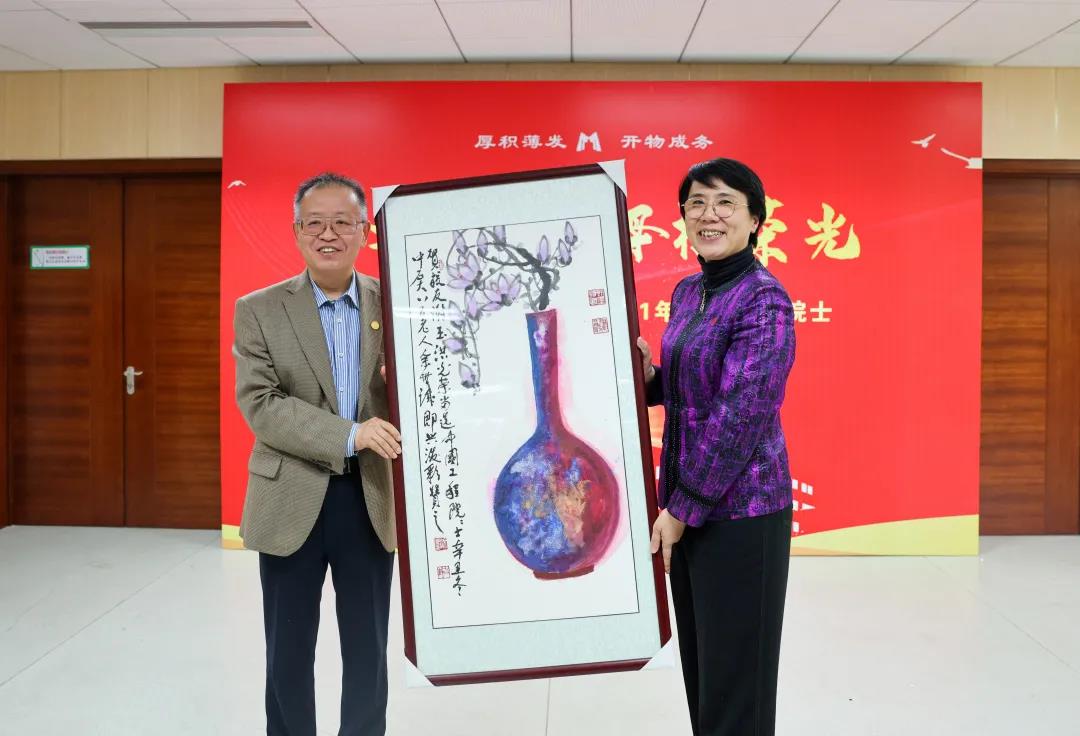 學校90多歲高齡的華澤澎教授得悉四位校友當選院士的喜訊后也非常高興,并和余世誠教授分別提筆潑墨,為四位院士題字作畫。陳峰、吳小林向新晉院士們贈送了書畫作品。