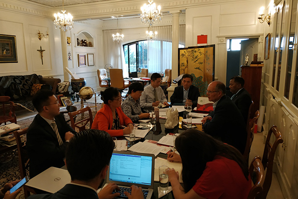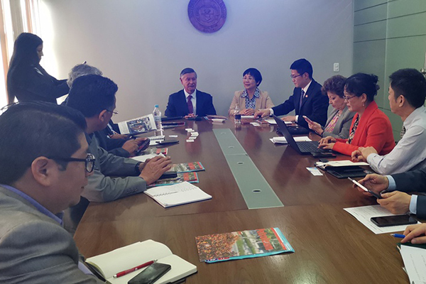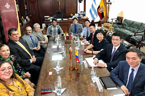 在厄瓜多爾期間,山紅紅一行還訪問了中國(guó)駐厄瓜多爾大使館、中國(guó)駐瓜亞基爾總領(lǐng)事館。大使館臨時(shí)代辦王新明、總領(lǐng)事張?zhí)戏謩e會(huì)見了山紅紅一行,并就中石大孔子學(xué)院發(fā)展、與當(dāng)?shù)亻_展教育合作和人文交流等話題進(jìn)行了深入交流。山紅紅一行還與厄瓜多爾思邈維華國(guó)際學(xué)校創(chuàng)辦人、厄瓜多爾教育與產(chǎn)業(yè)協(xié)作促進(jìn)會(huì)會(huì)長(zhǎng)梅炬銘會(huì)面,探討了有關(guān)合作事宜。