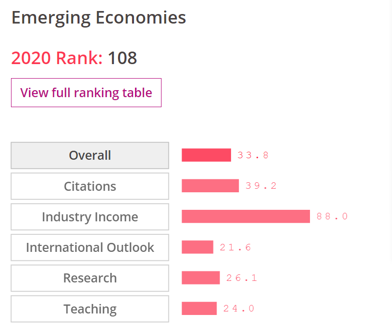 泰晤士高等教育新興經(jīng)濟體大學排名自2014年起每年發(fā)布一次,對位列富時全球分類系統(tǒng)(FTSE Global Equity Index Series)中先進新興經(jīng)濟體(advanced emerging)、次級新興經(jīng)濟體(secondary emerging)和前沿經(jīng)濟體(frontier)的國家和地區(qū)的大學進行比較。