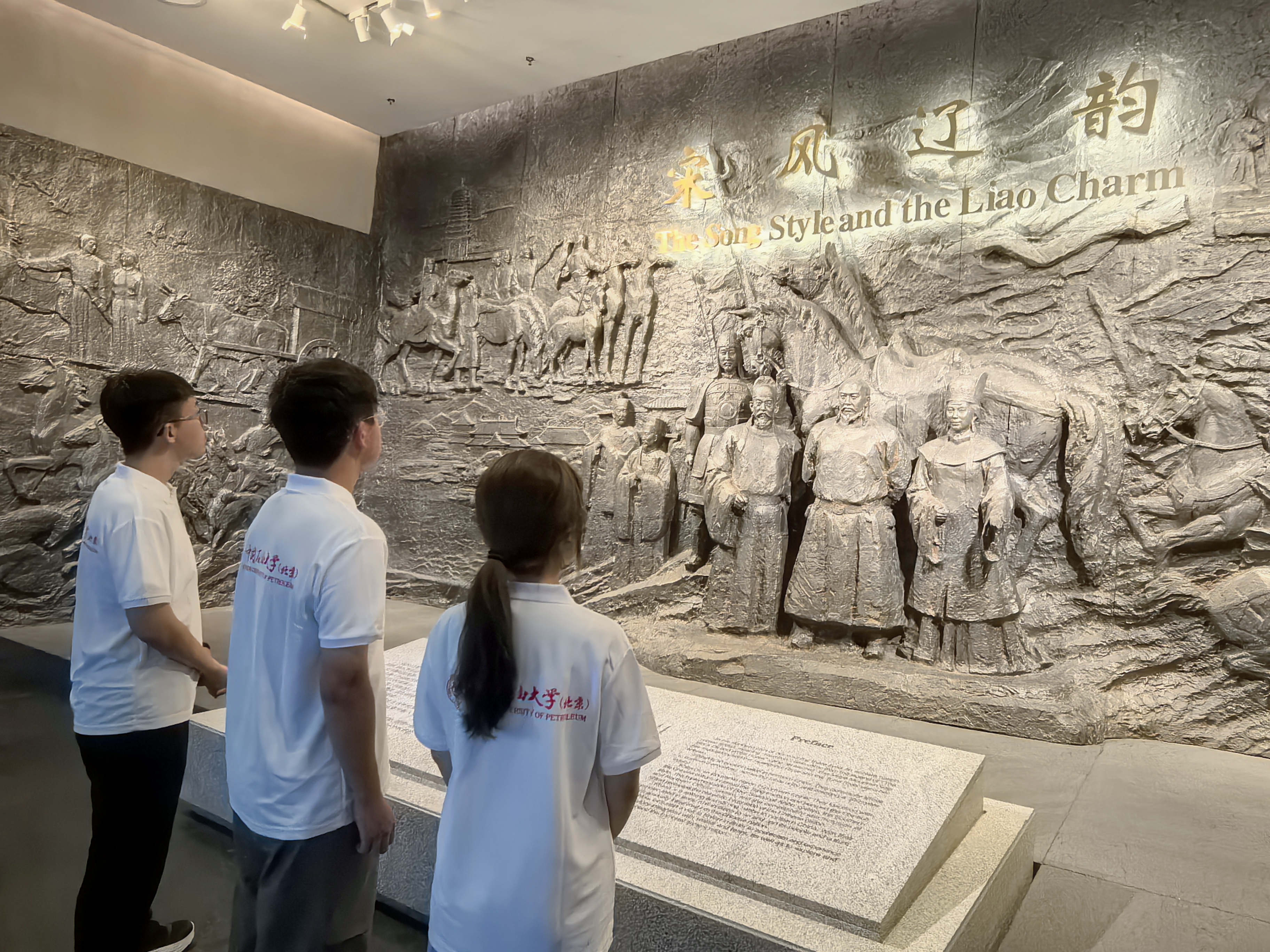 實(shí)踐團(tuán)探訪遼代歷史文化博物館,在千年文明回響中溯源根脈?!八物L(fēng)遼韻”展通過馬具、兵器、陶瓷絲織等展品,展現(xiàn)契丹民族興衰及農(nóng)牧文明交融的底蘊(yùn)與治理智慧;“北國丹青”壁畫展中多民族侍從和諧共處的細(xì)節(jié)尤為珍貴;“憑云出梵天”展呈現(xiàn)遼代融合佛教與本土信仰的成就,為當(dāng)代文化振興提供啟示。博物館的VR、AR系統(tǒng)深化了大家對(duì)遼代文化博大精深的認(rèn)知與保護(hù)傳承意識(shí),也為鄉(xiāng)村文旅活化提供了科技思路。
