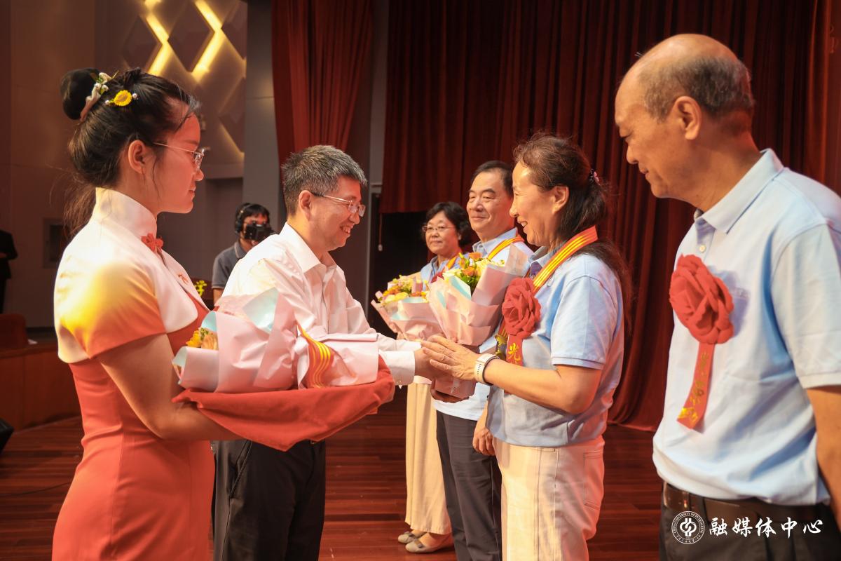 榮休典禮上,金衍為榮休教師代表頒發紀念獎章,鐫刻每位教師姓名及在校年限的獎章,凝結著學校對他們躬耕教壇、愛崗敬業、默默奉獻的致敬和美好祝福。