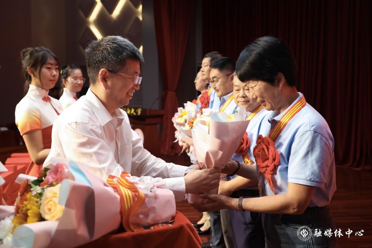 韓克飛和劉植昌為從教三十年的教師代表頒發證書和紀念獎牌。致敬他們三十載的奉獻付出,以及“躬耕教壇、強國有我”的使命擔當。
