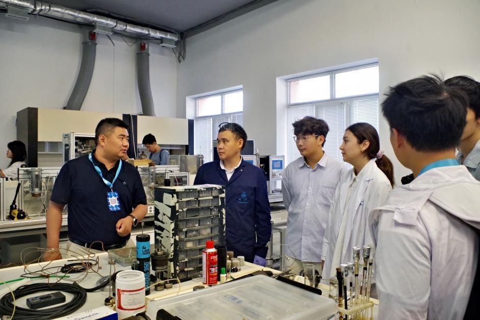 在哈薩克斯坦國家石油天然氣公司,師生近距離觀察阿特勞開采的原油樣品與巖心;里海石油天然氣設計研究所內,負責人系統介紹和展示了石油化工廠、天然氣處理站的設計邏輯與常用軟件;在New Tech System Group公司車間里,同學們學習了不銹鋼管道的剪切工藝、隔溫材料的特殊性能;在全球最大油田技術服務公司斯倫貝謝(阿特勞分公司)、北里海運營公司(NCOC),師生深入了解了行業的前沿動態。彭威帶領學生參觀了阿特勞石油與天然氣大學分校區化學實驗室,學習了廢水中氯元素含量測定、石油元素自動分析及油品物性檢測等專業知識。