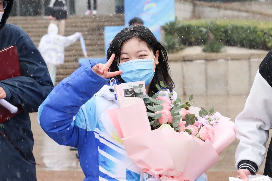學(xué)校6輛大巴車載著第一批返校的99名志愿者駛?cè)胄@。前來迎接的師生深情演唱歌曲《一起向未來》《雪花》,并將一束束象征著生機(jī)、活力的向日葵獻(xiàn)給志愿者。