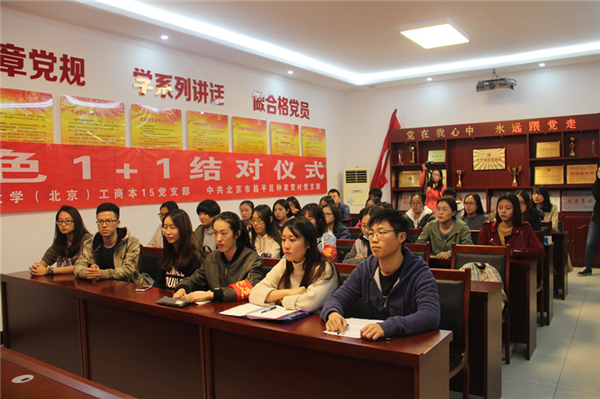 10月19日下午,中國石油大學工商管理學院本15黨支部與中共百善鎮鐘家營村支部委員會于百善鎮鐘家營村黨員活動室舉行紅色“1+1”結對儀式。