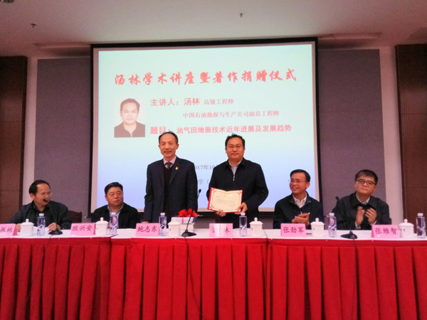 湯林向石大捐贈(zèng)了《油田采出水處理及地面注水技術(shù)》、《油氣田地面工程關(guān)鍵技術(shù)》等4部著作共70冊(cè)。鮑志東代表學(xué)校致辭并頒發(fā)捐贈(zèng)證書(shū)。湯林結(jié)合多年從事油氣田地面工程建設(shè)和生產(chǎn)技術(shù)管理的經(jīng)驗(yàn),講解了油氣田地面工程技術(shù)近年來(lái)的進(jìn)展和未來(lái)發(fā)展方向,內(nèi)容涉及油氣田地面工程現(xiàn)狀與主要指標(biāo)、近年的技術(shù)進(jìn)展、面臨形勢(shì)與挑戰(zhàn)等。湯林與與會(huì)師生進(jìn)行了良好的互動(dòng)和交流。