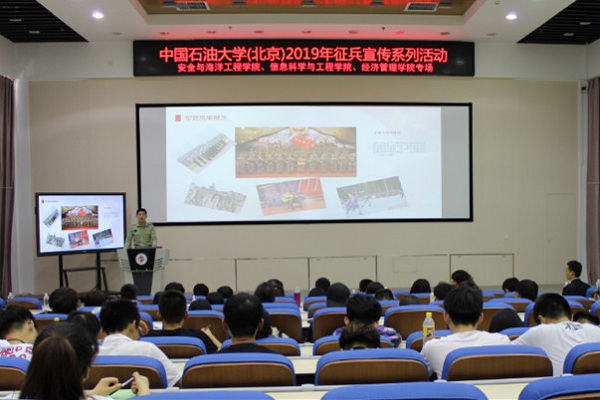 為進一步宣傳國家征兵政策,鼓勵新時代大學生以青春熱血報效祖國,5月29日,中國石油大學經濟管理學院、安全與海洋工程學院以及信息科學與工程學院聯合舉辦了2019年征兵宣講活動。北京市昌平區武裝部部長陳軍,中國石油大學學生工作部副部長、武裝部副部長戴兵,經濟管理學院黨委副書記沈慶寧,安全與海洋工程學院黨委副書記趙凱,信息科學與工程學院黨委副書記于迎輝,在校退役大學生代表,各學院征兵工作聯絡人以及40余名學院應征青年代表參加了本次活動。